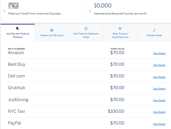 Screenshot showing the redemption value for 10,000 AmEx Membership Points if redeemed at checkout while shopping. 10,000 points is worth $70.00 USD.