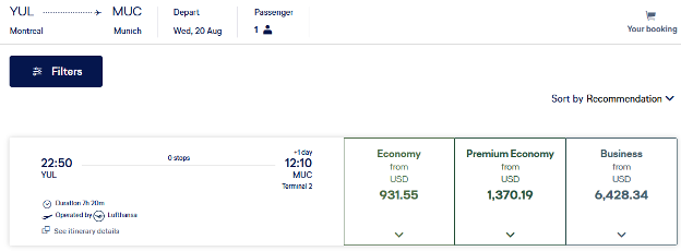 For example, consider this one-way Lufthansa business class flight from Montreal to Munich. It costs 88,000 miles (plus $59 in taxes and fees) when booked with United MileagePlus, but $6,428 when booked with cash through Lufthansa. Booking this flight with points and miles would net you a whopping 7.2 cents per point in value – a great deal if you’re looking to fly in luxury.