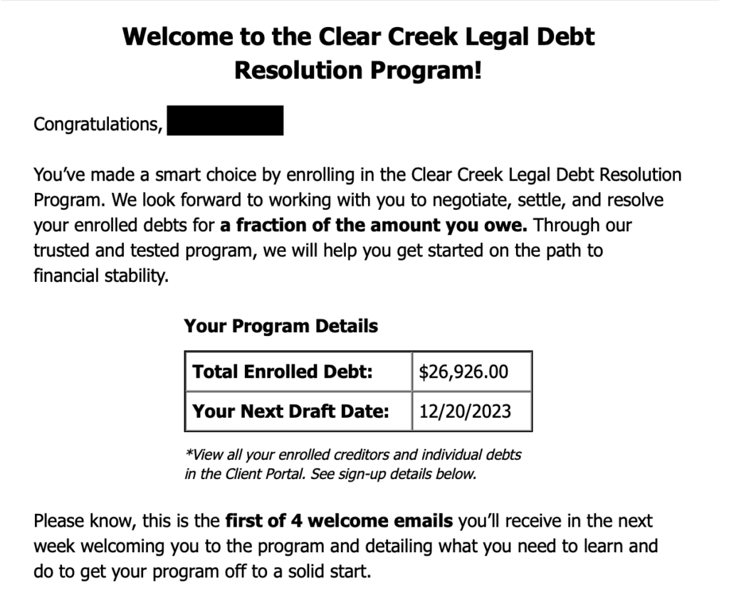 Davis was almost $27,000 in credit card debt when she learned about the Clear Creek Legal Debt Resolution Program in November 2023. After enrolling, Davis received a welcome email from the company telling her she’d made a smart choice and, with its help, would have her debts negotiated, settled and resolved for a fraction of what she owed.