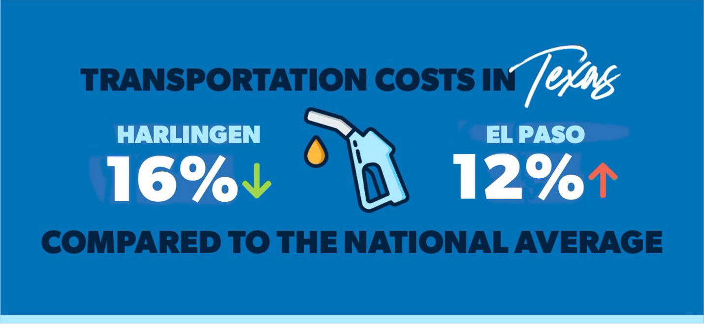 Rev up your engines! Texas transportation costs range from 16% lower than the national average in Harlingen to 12% higher in the border city of El Paso. Fort Worth slides into the middle range for transportation costs among most Texas cities, which is 8% lower than the national average.