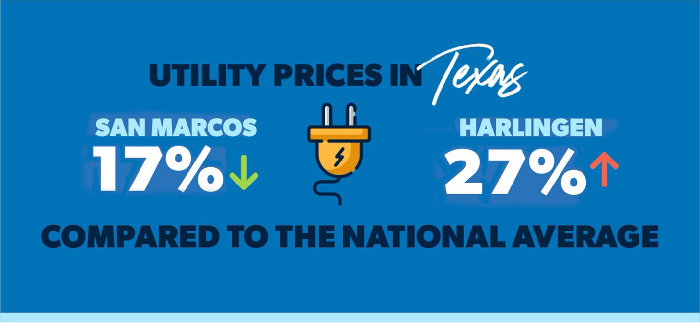 Utility costs like energy and phone service in Texas range from 17% lower than the national average in San Marcos to 27% higher in Harlingen. Denton is somewhere in the middle range among Texas cities for utility costs at 1% higher than the national average.