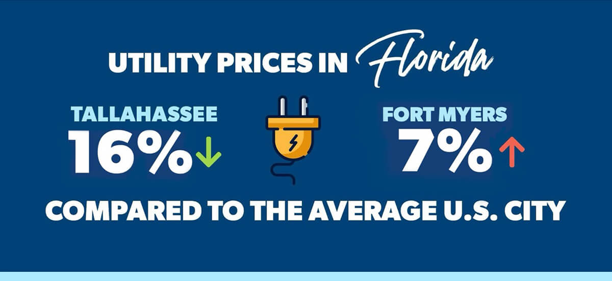 Utility costs like energy and phone use in Florida range from 16% lower than the national average in Tallahassee to 7% higher in Fort Myers. Daytona Beach is somewhere in the middle range among Florida cities for utility costs.